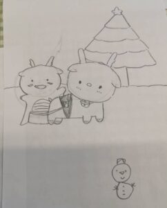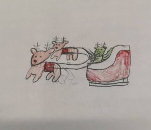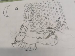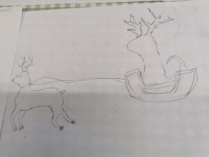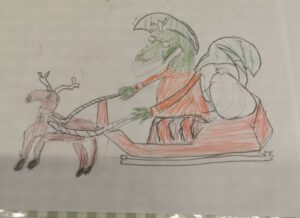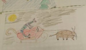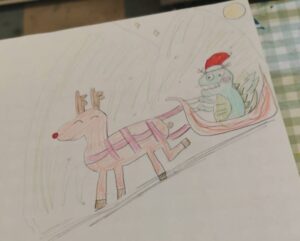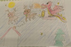 【トナカイのひっぱるソリに乗っている竜】というお題でみんなに描いてもらいました。