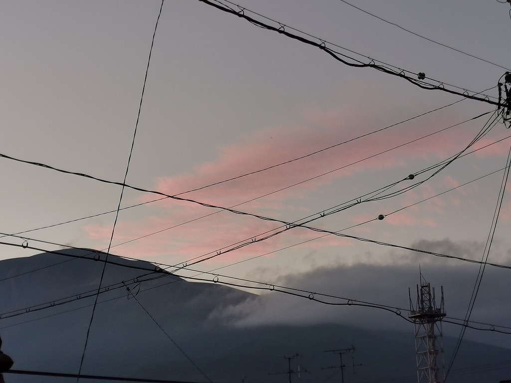教室の窓からの浅間山・ピンクの雲の色の素晴らしさ