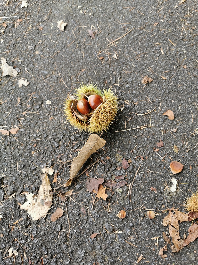 落ちているクルミを足でつぶすと…ごろり!クルミが出てきます